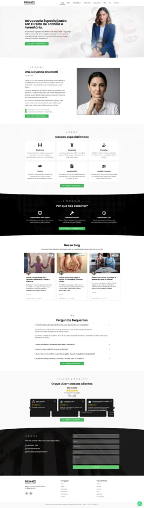 Site One Page feito para a Dra. Dayanne Brumatti, especialista em Direito de Família e Inventário, apresentando e advogada e sua experiência no ramo, incluindo um blog para artigos.